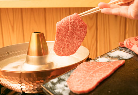 希少部位とは、牛の中で最高級の肉質を誇るシャトーブリアン(フィレ)と、サーロイン。後者のしゃぶしゃぶは見かけることもあろうが、1cmほどある分厚いシャトーブリアンのしゃぶしゃぶなど、滅多にお目にかかれるのものではない。