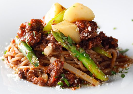 左.からすみと茶豆のタリオリーニ。自家製の手打ち生パスタを使用する
