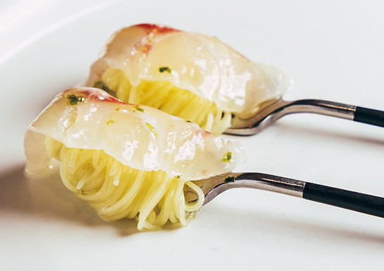 「CHEF’S TABLE」には、ゲストテーブルのすぐ隣に調理台がある。ゲストはシェフが自分たちのためだけに腕を振るう姿を見ながら、しかも出来立てホヤホヤの料理を堪能できるのだ。