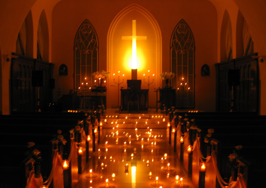 教会という荘厳な場所で行われるのは、イルミネーションやキャンドルを灯す演出。