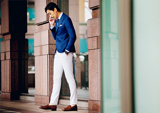 そこで普段から着慣れている無難なジャケパンスタイルに、新鮮味と季節感とを添えてくれる選択肢として、いつものグレースラックスを白パンに変えてみてはいかがだろうか。