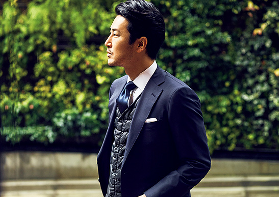 例えば、アウトドアブランド『モンベル』のダウンベスト。これは驚くほど軽くて薄いので、スーツのインナーとして着ても、ゴワついた感じは一切なく扱いやすい。