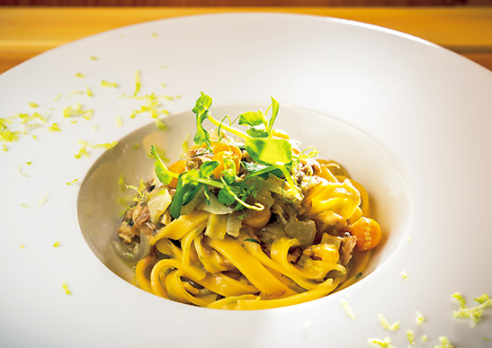 当夜の主役は何と、すっぽん。4時間もかけて丁寧にとった出汁で穴子をしゃぶしゃぶに。この前菜だけでも驚くに十分だが、特に感激するのはパスタだ。