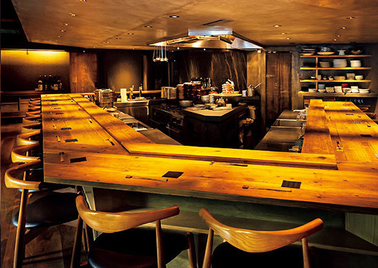 ここでは、すべてフルフラットのカウンターという特性も活用し、食材のプレゼンテーションから調理プロセス、盛り付けに至るまで、すべてオープンにすることを指向したイタリアンである。