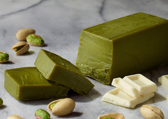 3種のピスタチオペーストとホワイトチョコレート、生クリームなどを絶妙なバランスで合わせ低温で蒸し焼きにすることで、しっとりとなめらかなくちどけを実現。