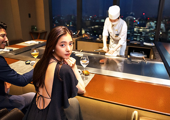 ラグジュアリーホテルの最上階、夜景を望む個室、ライブ感溢れるカウンター。そんな魅力的な一軒にお連れしたのは、新木優子さん。
