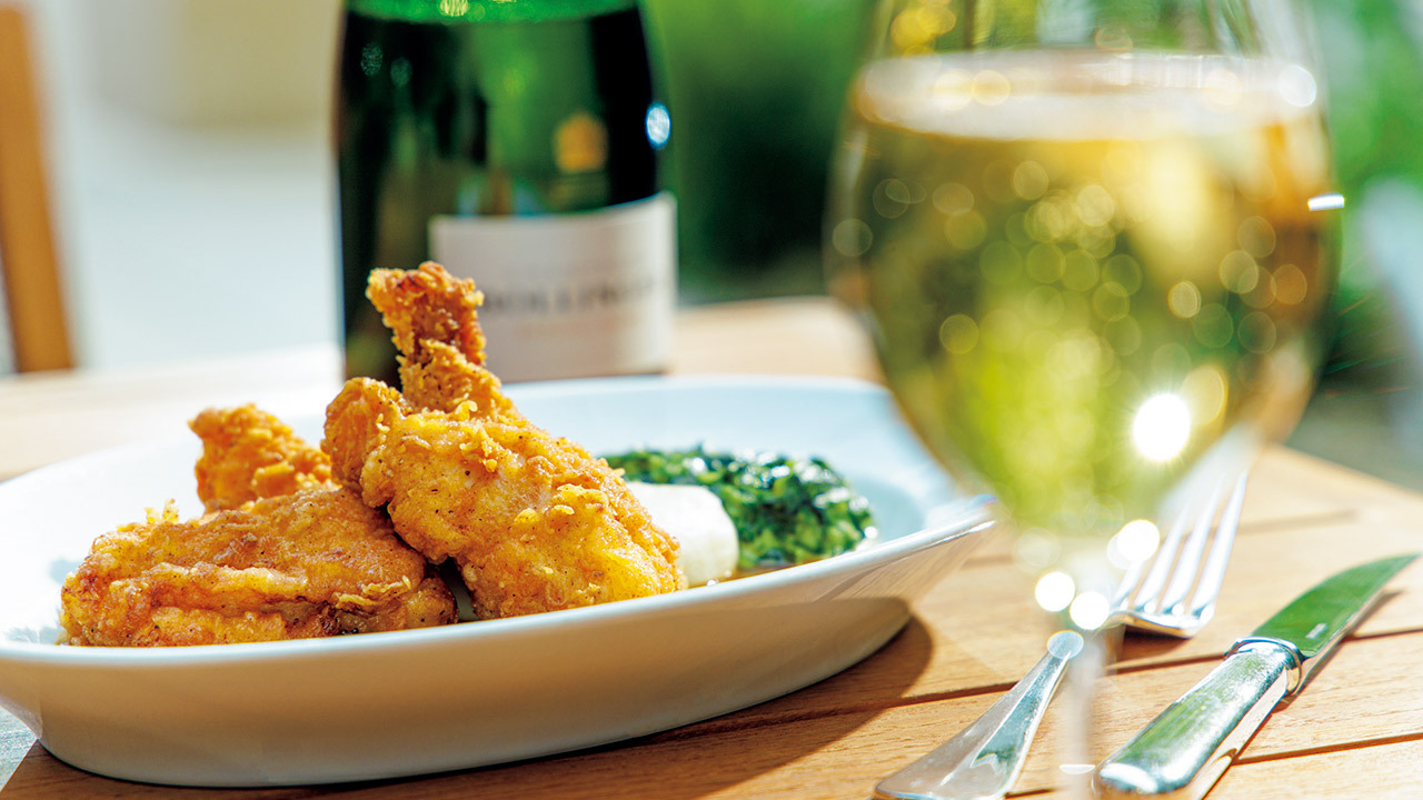 バターミルクやスパイスでマリネして揚げ、鶏の旨みが凝縮したグレービーソースを添えている。カリッとした衣の中から熱くジューシーな肉汁が溢れ出し、冷えた“ボランジェ”を飲めば相性抜群。