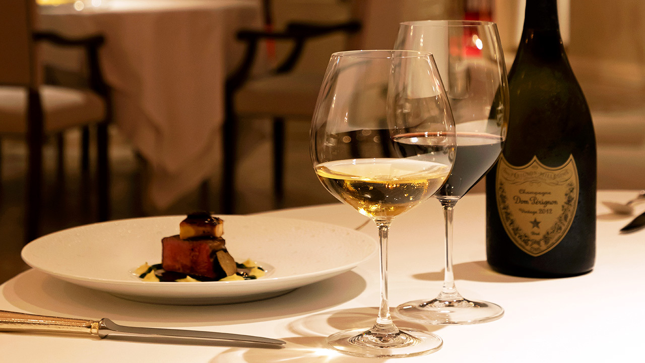 いまなら5月11日まで提供する「ドン・ペリニヨン」のボトル1本と、ワイン2杯が付く「90周年記念特別プラン」の満足度がすこぶる高く、極上の時間を過ごせる。
