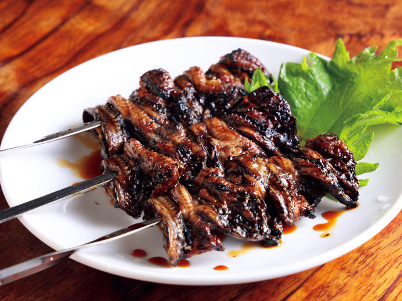 金串に打たれた大名物、香ばしい「どじょう蒲焼」は1串¥132。