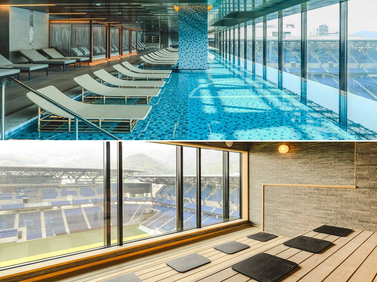 窓一面から陽の光がふりそそぐプールや半露天ジェットバス、サウナからもサッカースタジアムの壮大な景色が広がり、開放感抜群。