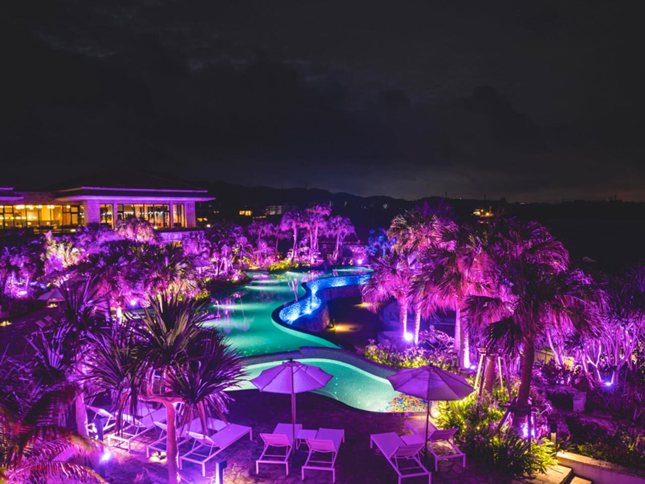 曲線が美しい沖縄の城(グスク)壁をモチーフとしたグスクプールに加え、沖縄県内でも珍しい、海水が常時循環するインフィニティプール、海と一体化するラグーンのアウトドアプールと、ライトアップした明かりに照らされ、心奪われる煌めく情景を映し出す。