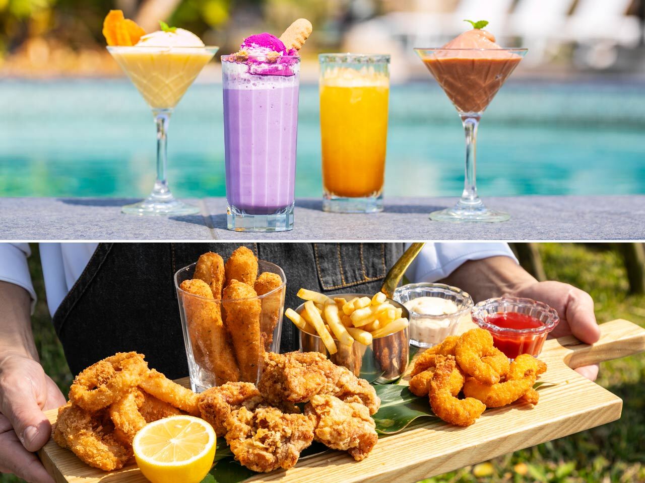 瀬良垣の海を広々一望できる『ザ・アイランド プールサイドバー』では、鮮やかなトロピカルカクテルに、シェフ渾身のパーティープレートなどがラインナップ。