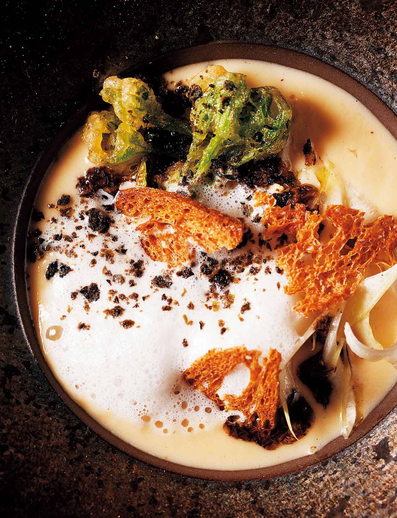熾火で加熱した新玉ねぎ、山菜のベニエ、薪で直接香りをつけた牛乳の泡などで構成された「新玉ねぎのスープ」。