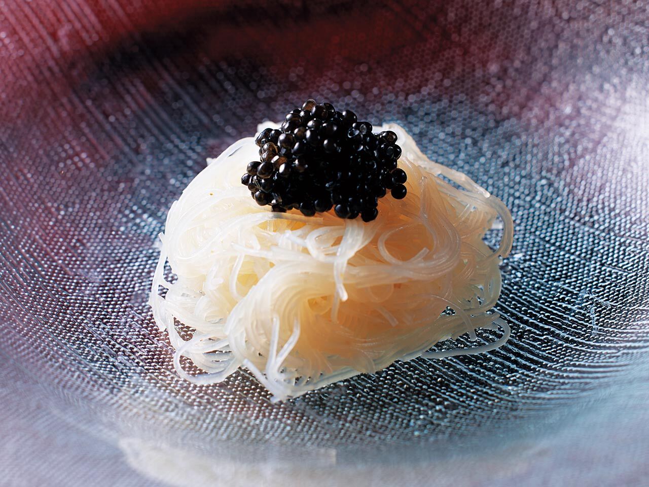 「キャビアビーフン」は、修行先である『わさ』の山下シェフから直々に指導を受け、忠実に再現している。