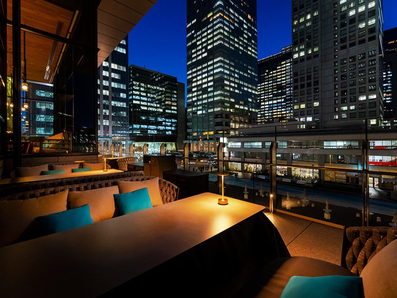 天井が高く贅沢な店内や、シティービューが広がるテラスなど席種も豊富。