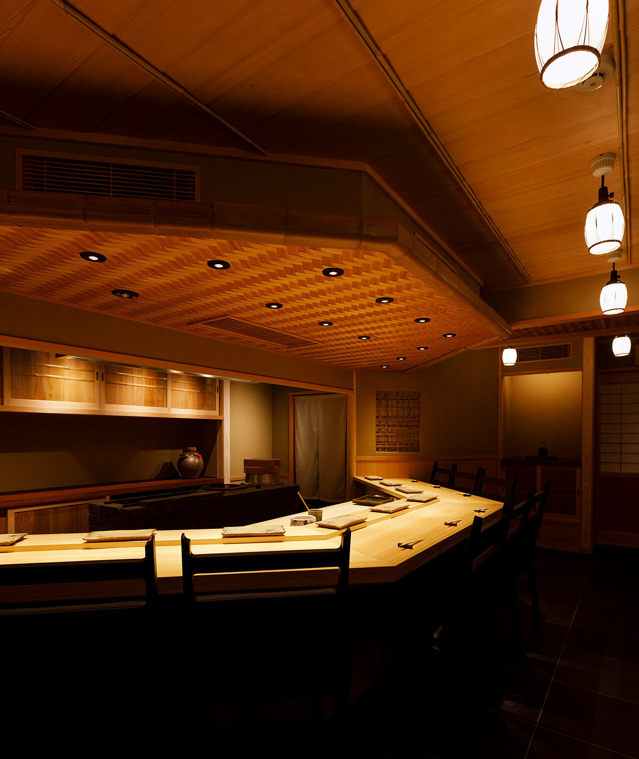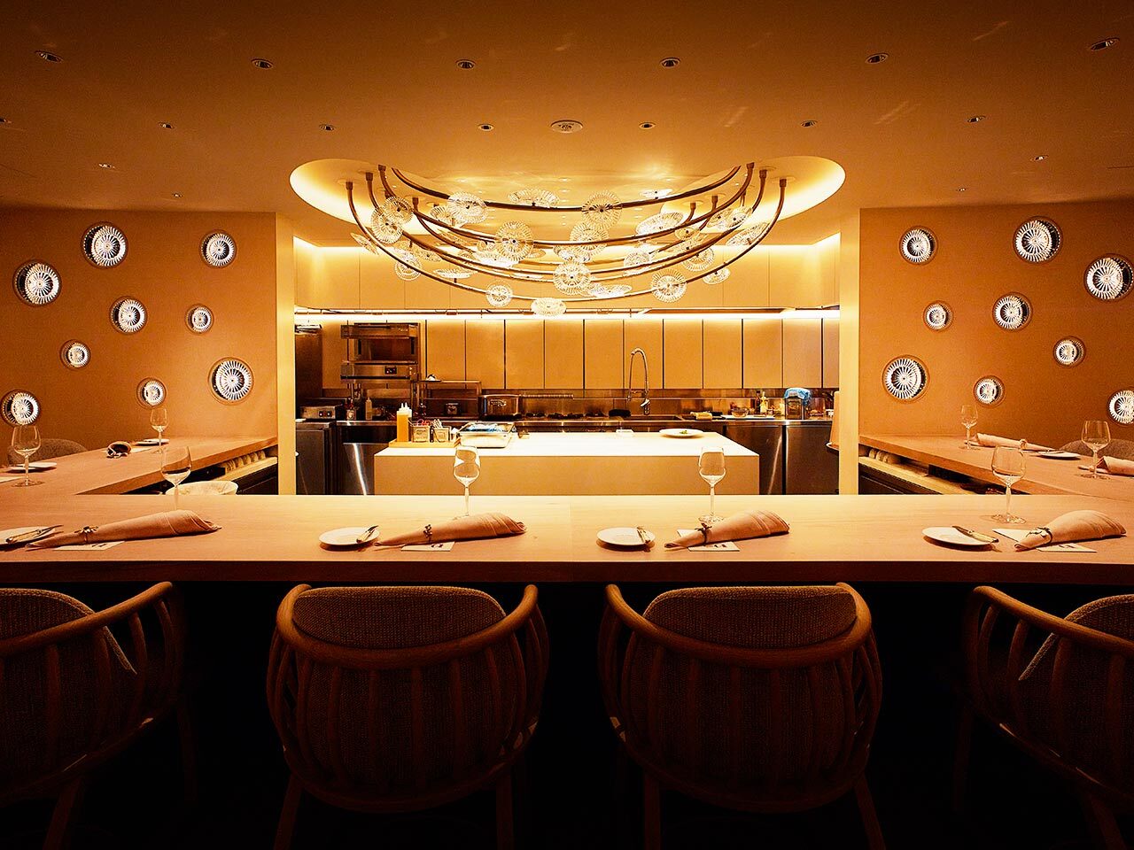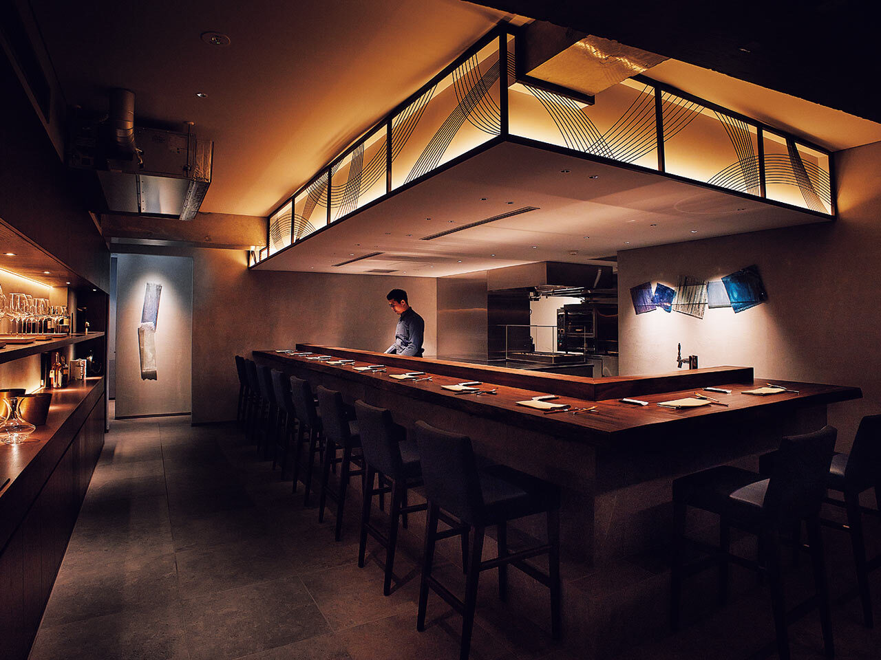 隠れ家のようなビルの9階、カウンタースタイルの華やかなダイニングは森田恭通氏の手によるもの。