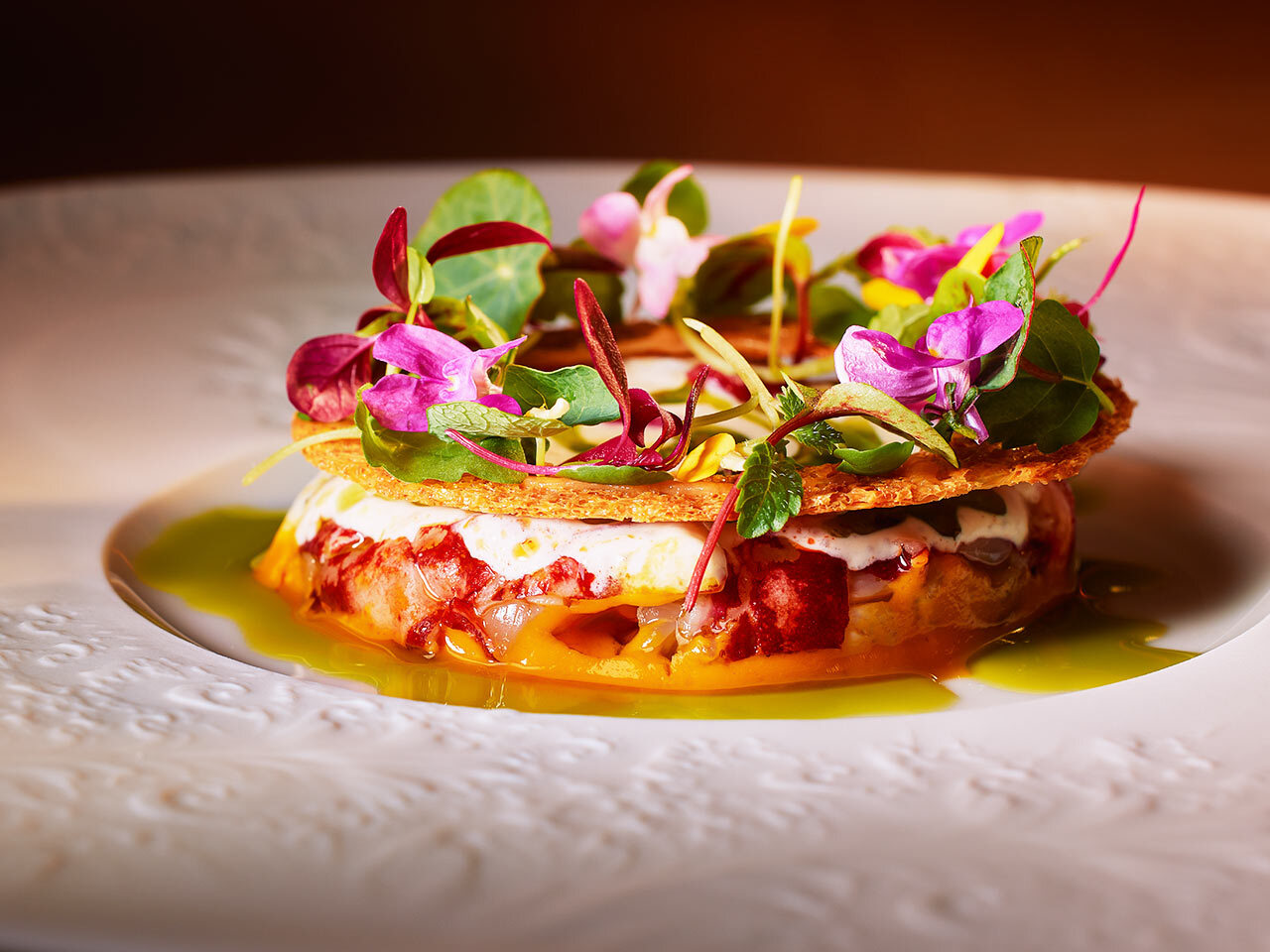 例えば、レアに仕上げたオマールエビにチュイールとエディブルフラワーをあしらったひと皿は、まるでお菓子のような愛らしさ。