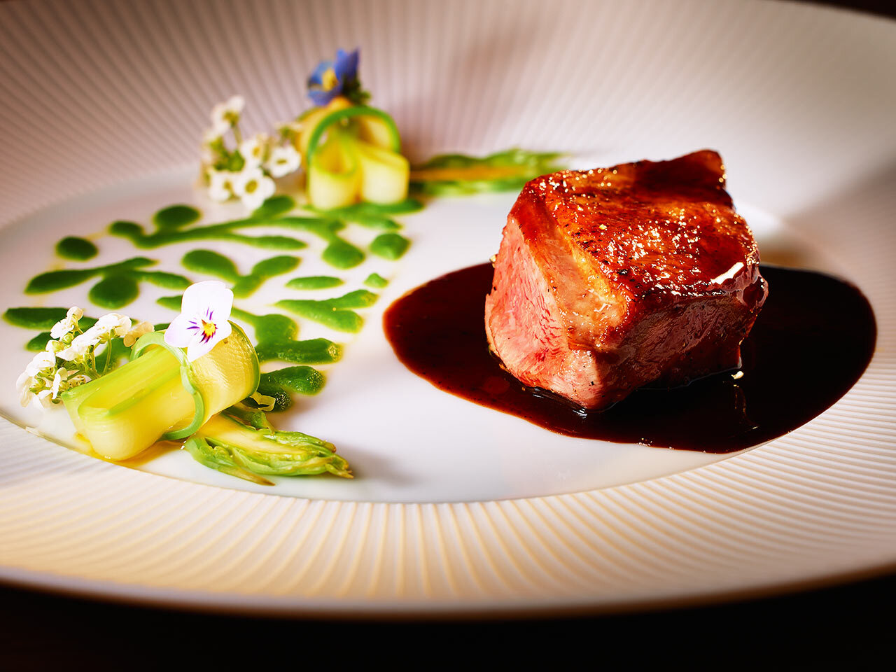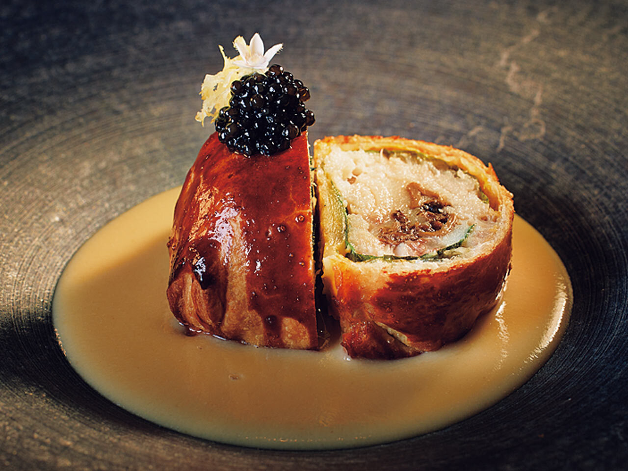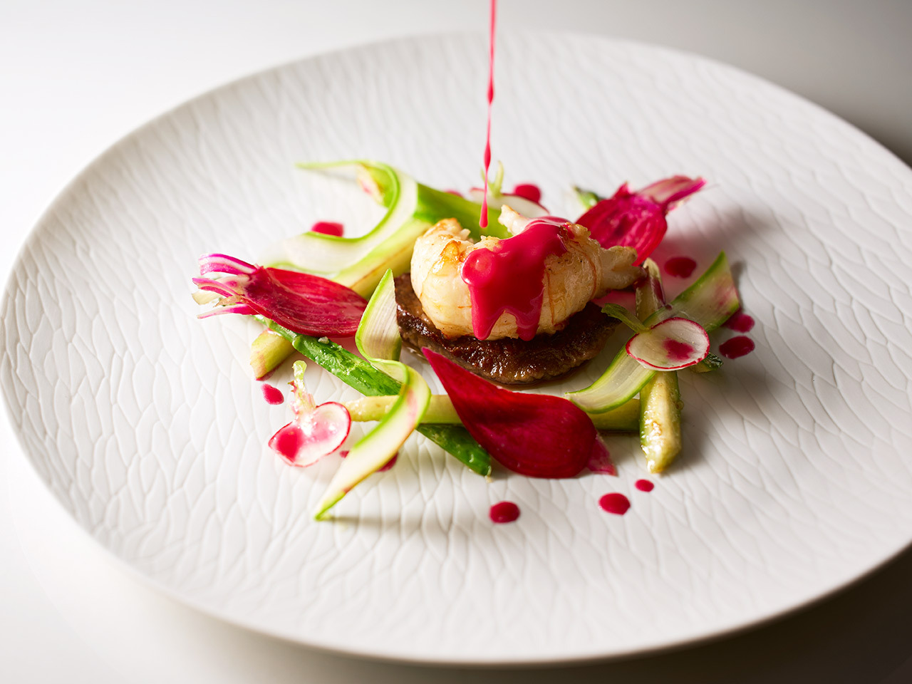 ラグジュアリーな中にも気品漂う空間同様、目の前で仕上げられていく皿の数々も実に艶やかだ。
