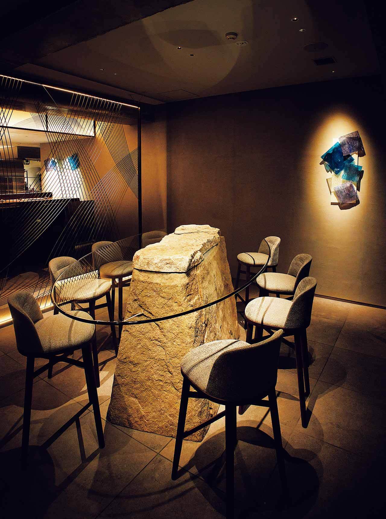 アーティスティックな石とガラスのテーブルが出迎えてくれる空間も斬新ならば、シェフの伊東 彰さんが編み出す料理にも独自のセンスが光るのが『東麻布いと』だ。