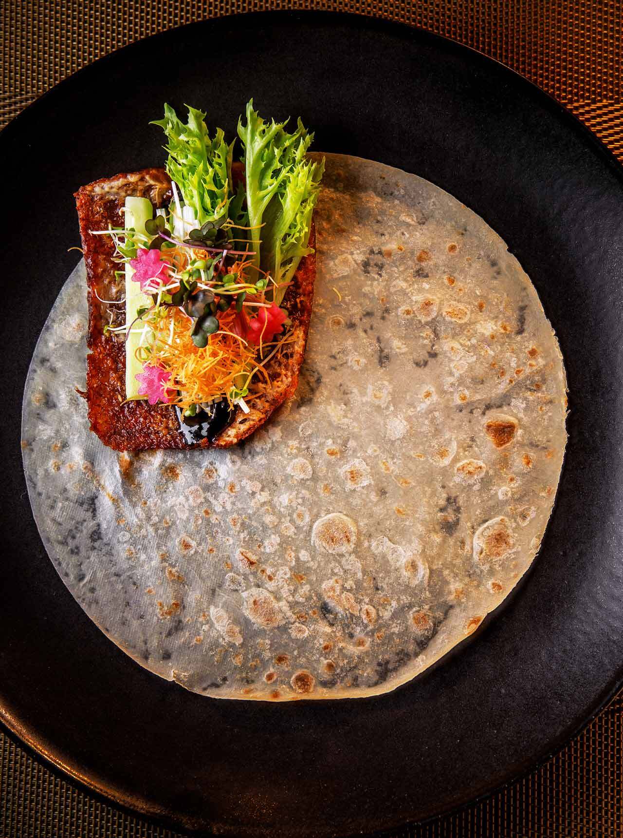 「北京ダック」は、パリッと焼かれたアヒルの皮の上に色とりどりの野菜や揚げたカダイフをのせた状態で登場。
