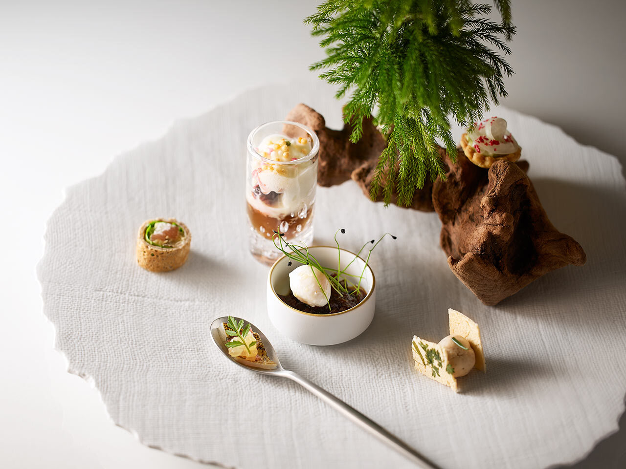 “Le début du voyage(旅の始まり)”と題したアミューズブーシュは、サヨリと柑橘、白アスパラガスとホタルイカ、タスマニアサーモンといぶりがっこなど、目にも舌にも楽しいフィンガーフードが。