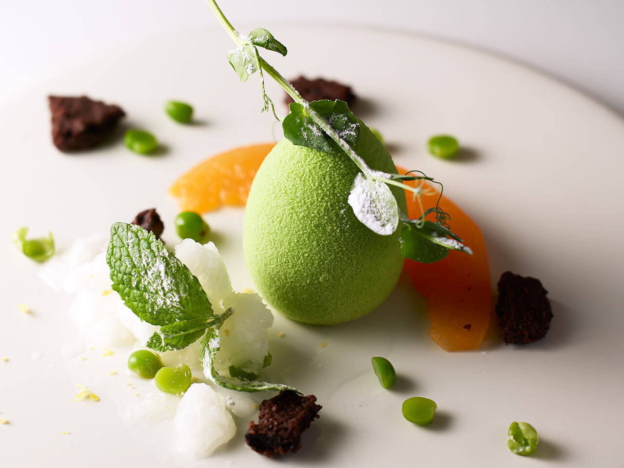 デセールの「グリーンピース メロン」は、グリーンピースのパルフェグラッセを主軸に、赤肉メロンのポルト酒マリネなどで構成。楽しい驚きに満ちたひと皿だ。