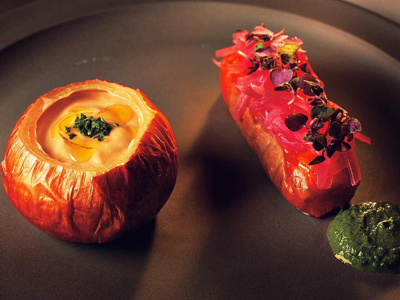 ハイビスカスとビーツのソース&柚子香るデーツのピュレを添えた鴨肉のハンバーグと、ヴァプールにした卵黄や魚醤を使ったタルタルソースで味わうカキフライがセットに。