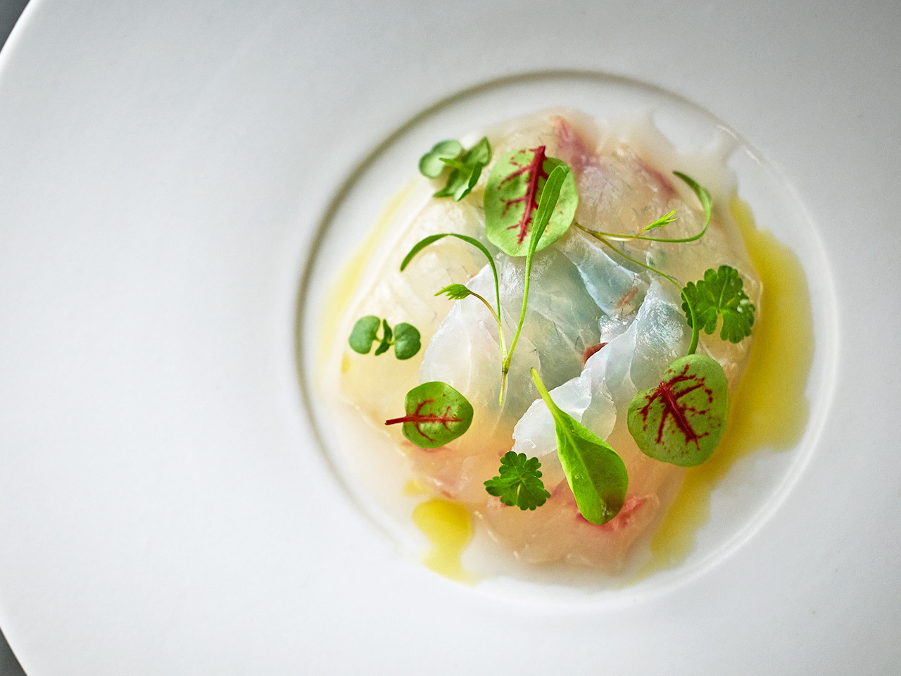 「真鯛のカルパッチョと山菜のサラダ仕立て」。