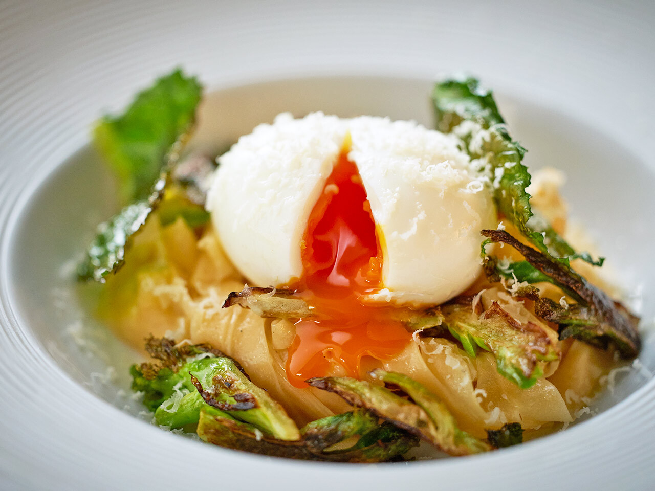 バターで和えたタリアテッレに、「髙橋農園」のつぼみ菜の滋味と秦野「みくるべたまご自然農場」の放し飼い有精卵の濃厚なコクが重なる。