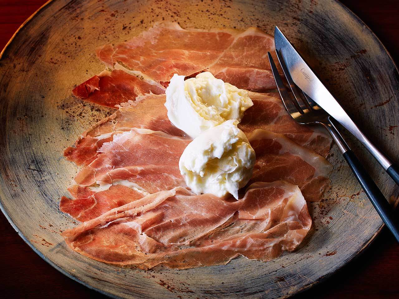 熟成12ヶ月の麦豚の生ハムは脂の口溶けが良く、オリーブオイルなしでもチーズとの相性抜群。