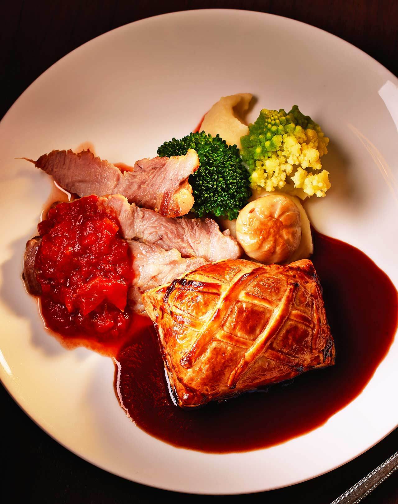 ご馳走がコンビになった「豚肩ロースのスパイス焼き、蝦夷鹿ミンチ肉のパイ包み焼き」。