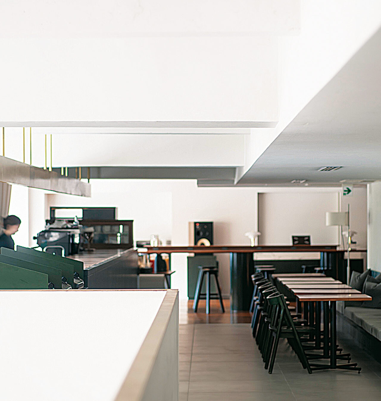 設計担当は、空間デザイナーの二俣公一氏が率いる「ケース・リアル」。アーチ形の窓にかかる木製ブラインドも深緑に塗られ、そこから入る光が緑色を明るくする。