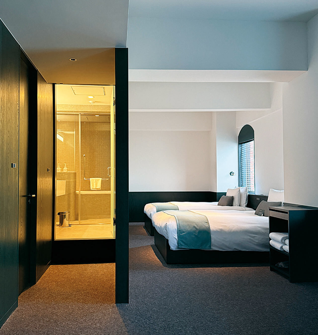 客室に入ると、時間ごとの光で壁の緑の色味が変わり、それに気付けるのもミニマルデザインだから。