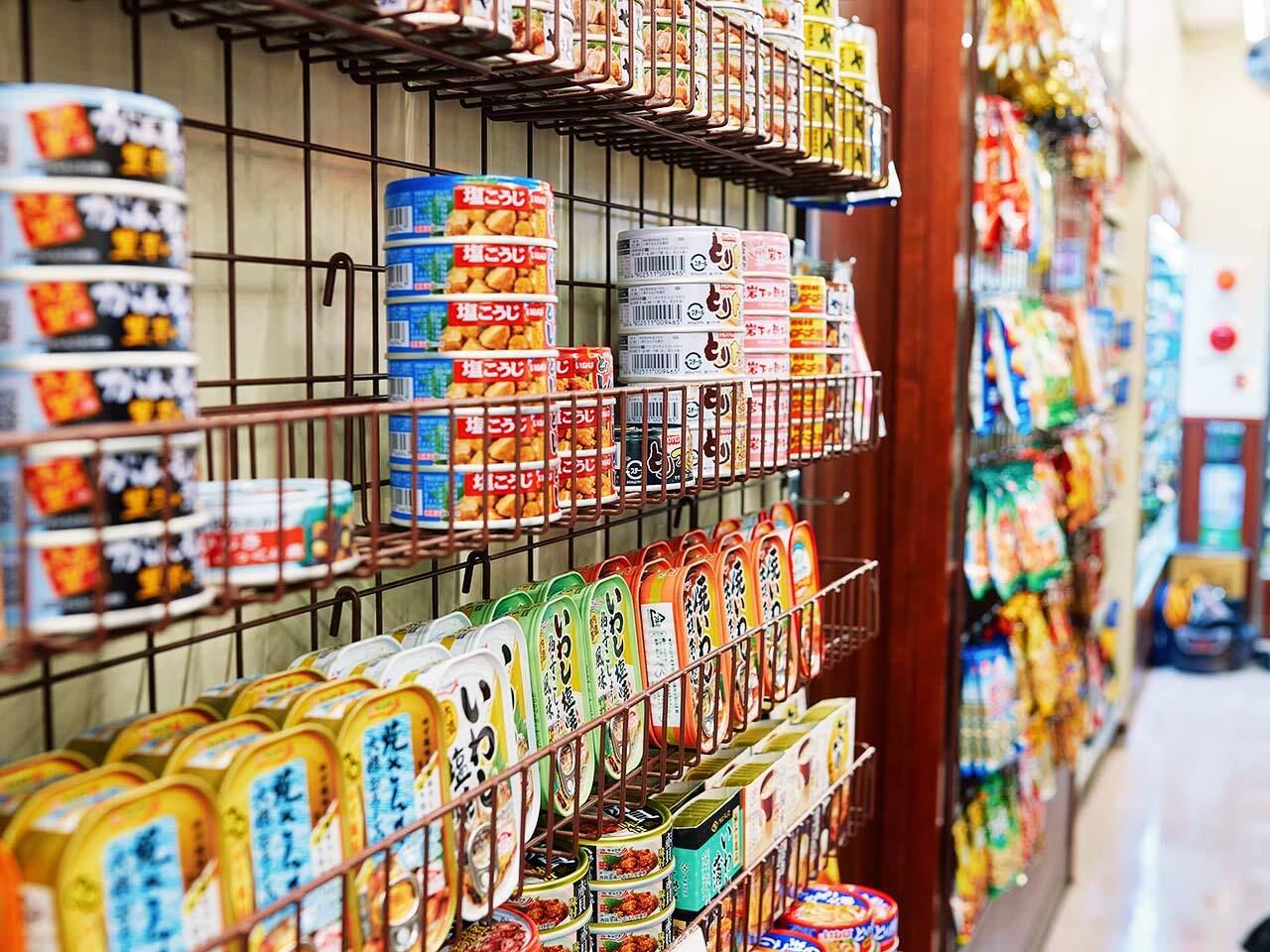 缶詰は懐かしのホテイ「やきとり」から、ちょっと高級なものまで並ぶ。