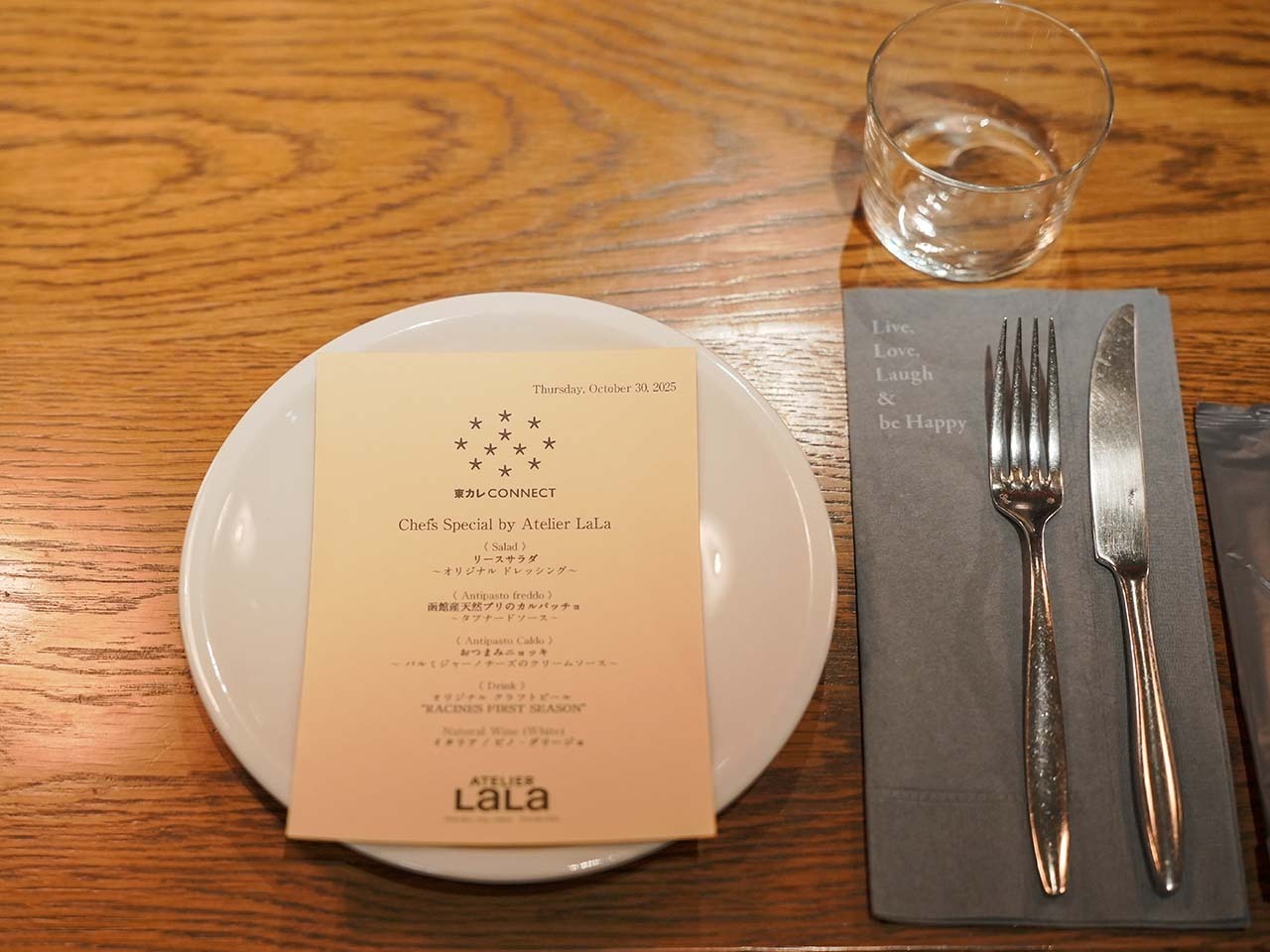 『Atelier LaLa(アトリエララ)』では、リースサラダ、カルパッチョ、ニョッキの3品をいただきました。ドリンクは、RACINES(ラシーヌ)のオリジナルクラフトビールとナチュラルワインをペアリング。