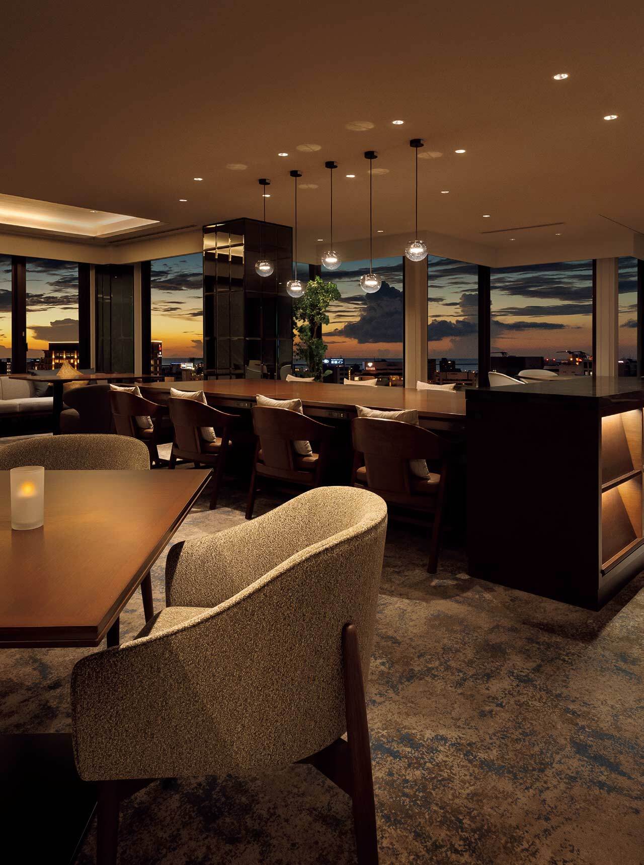 圧倒されるのが那覇市内最大級の広さを誇る「クラブラウンジ」。大きな窓から街を一望でき、特にマジックアワーは圧巻だ。幻想的な景色を眺めながらオリオンビールや琉球泡盛のフリーフローを楽しむ至福の時間は、贅の極み。