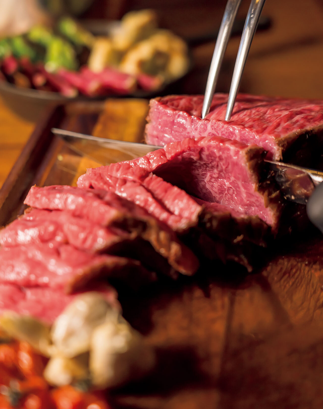 鮮やかな手際で切り分けられた肉の断面から、美しいロゼピンクが現れれば、興奮がふたりを包むのだ。