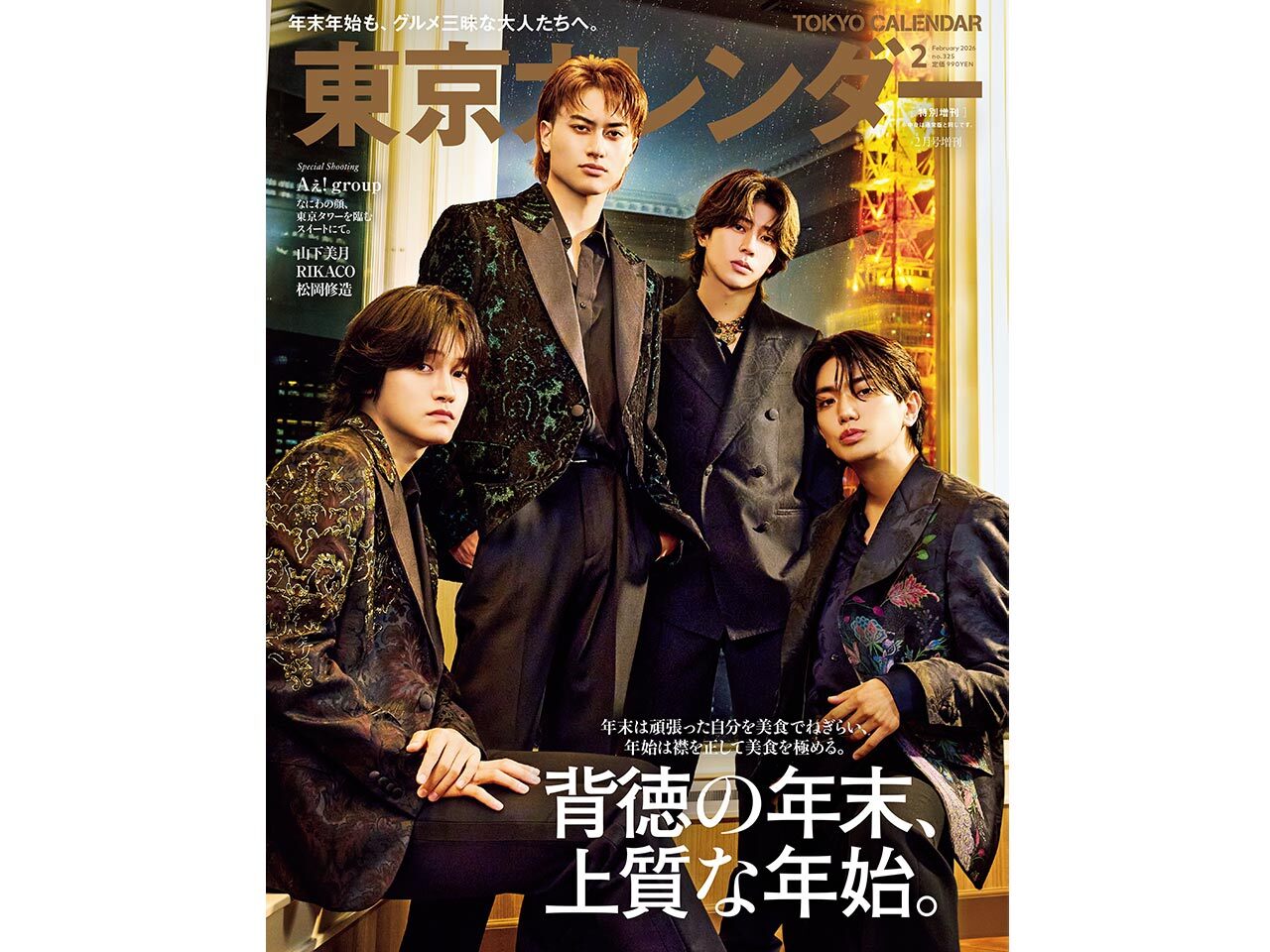 東京タワーを背負いド派手に表紙を飾ってくれたのは、関西出身者で組むAぇ! groupの正門良規さん、末澤誠也さん、小島 健さん、佐野晶哉さん。