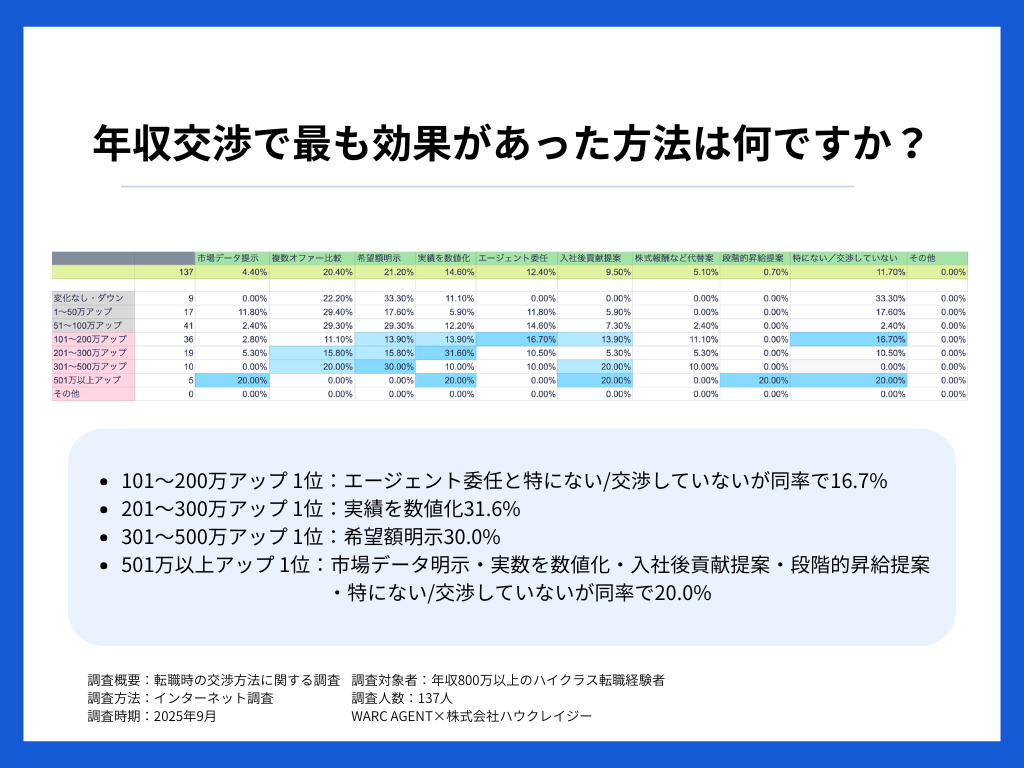 本調査で最も興味深いのは、年収アップ額に応じた「有効な交渉手段」の違いだ。