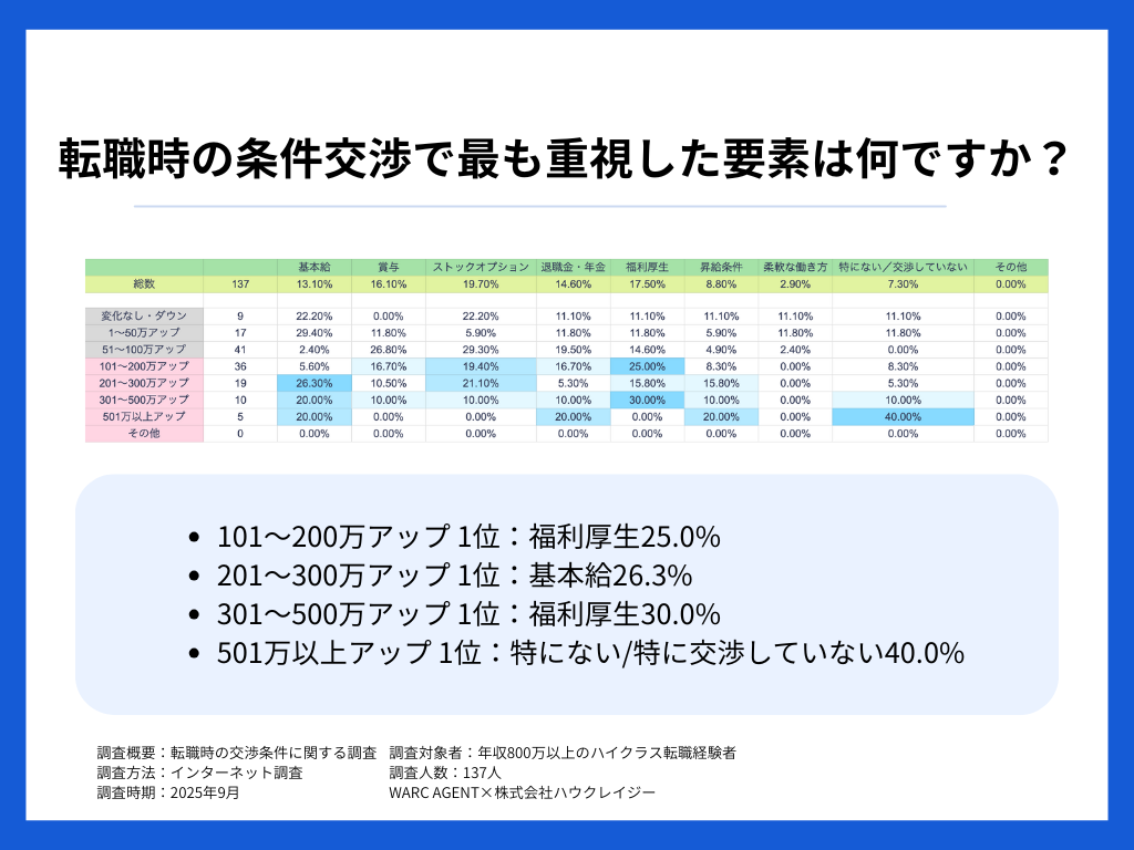 100〜200万円アップ層と300〜500万円アップ層が、交渉時に最も重視した要素として「福利厚生」を挙げている点だ。