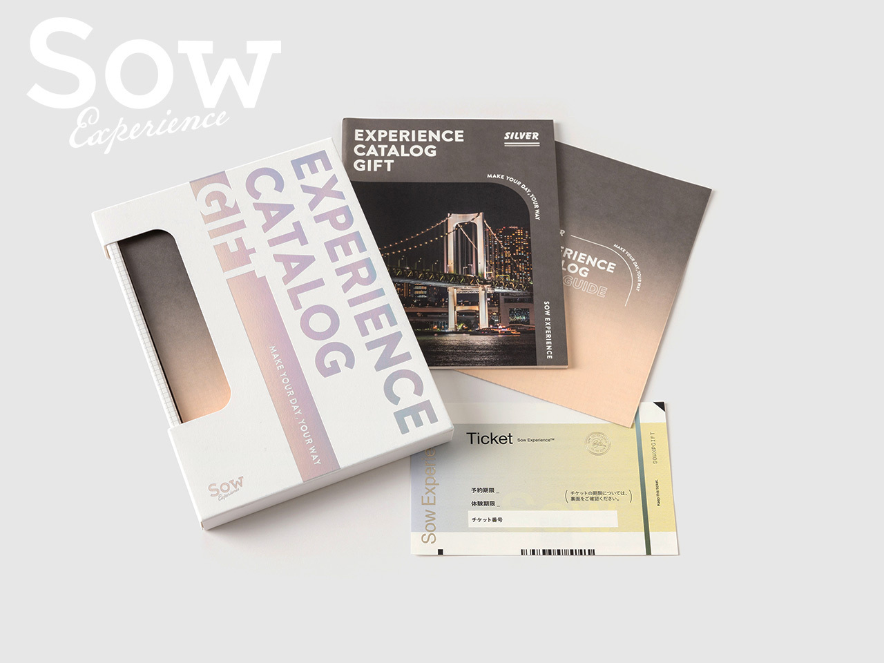 対象商品7,000円(税込)毎を一口として何度でも応募できるA賞は『SOW EXPERIENCE 総合版カタログギフト』(SILVER)。抽選で5名様に当選。