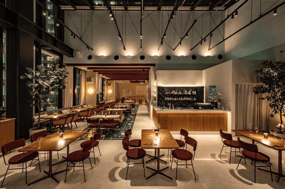 「赤坂インターシティAIR」内に佇む、開放感あふれるダイニング。期間中は「ドン・フリオ 1942」のラグジュアリーな装飾が施され、都会の真ん中にいながらリゾートのような高揚感に包まれる。