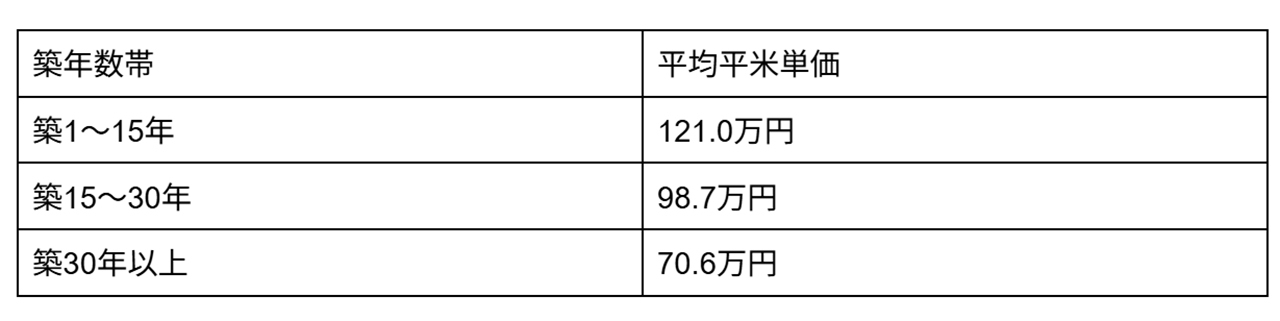 マンションナビが公開する世田谷区の築年数帯ごとの平均平米単価を見ると、築浅と築古の差がわずか22万円(平米単価)程度に収まっていることに驚かされる。