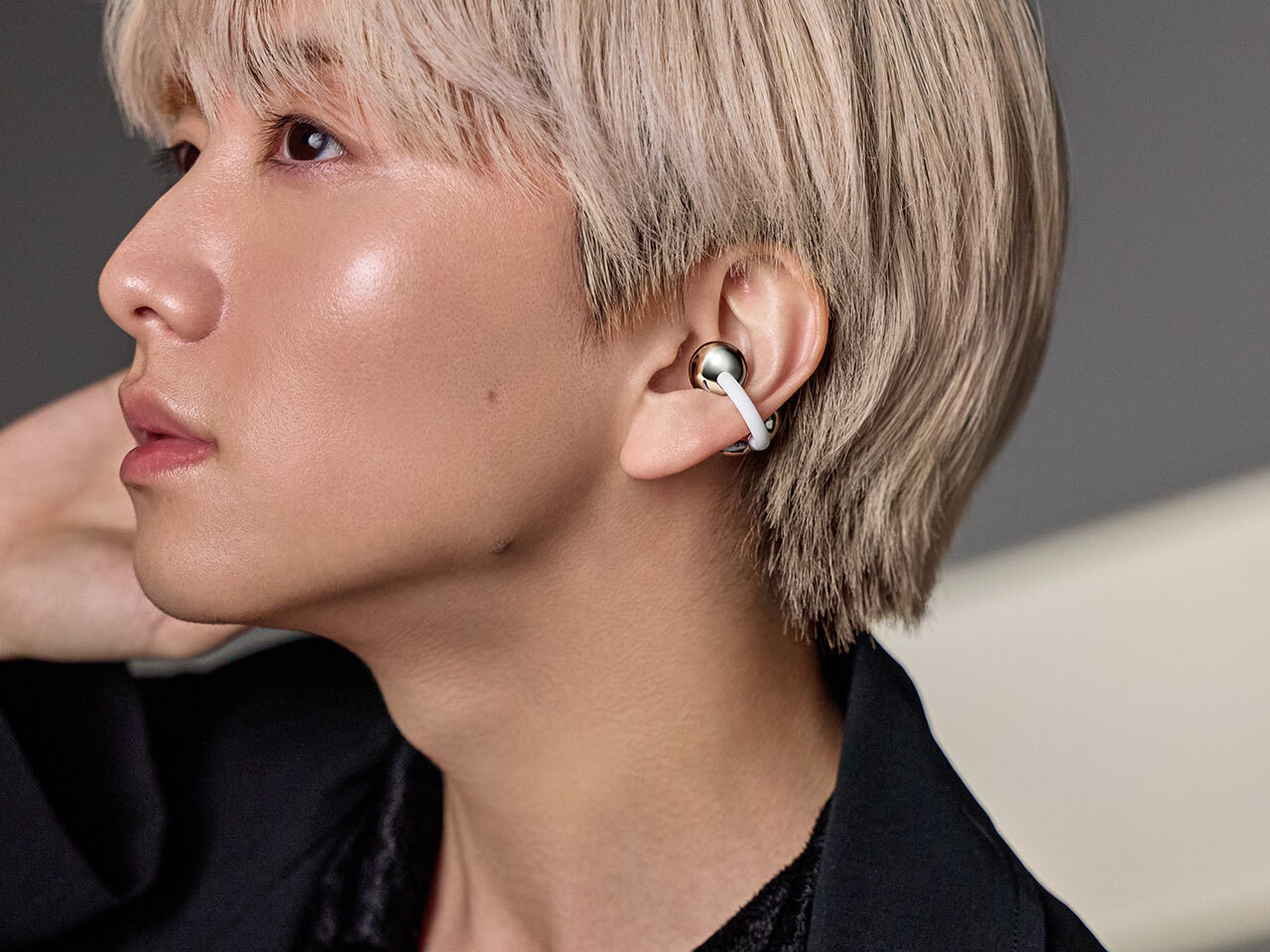黒いジャケットに身を包んだ板垣李光人さん。その耳には「HUAWEI FreeClip 2」のホワイトがかかっている。まるでアクセサリーのように自然に溶け込み、スタイリッシュ。言われなければイヤホンと分からないほど。