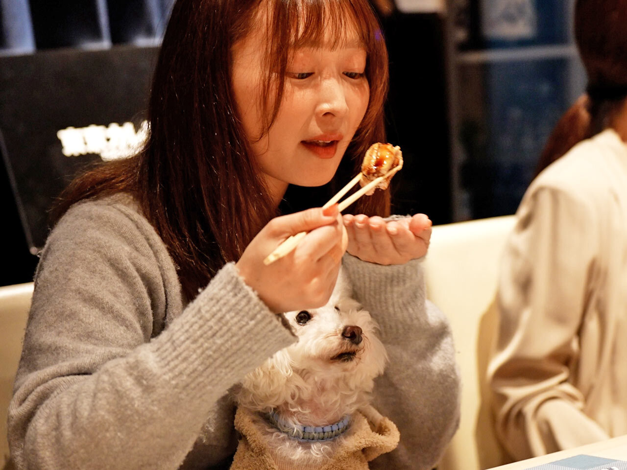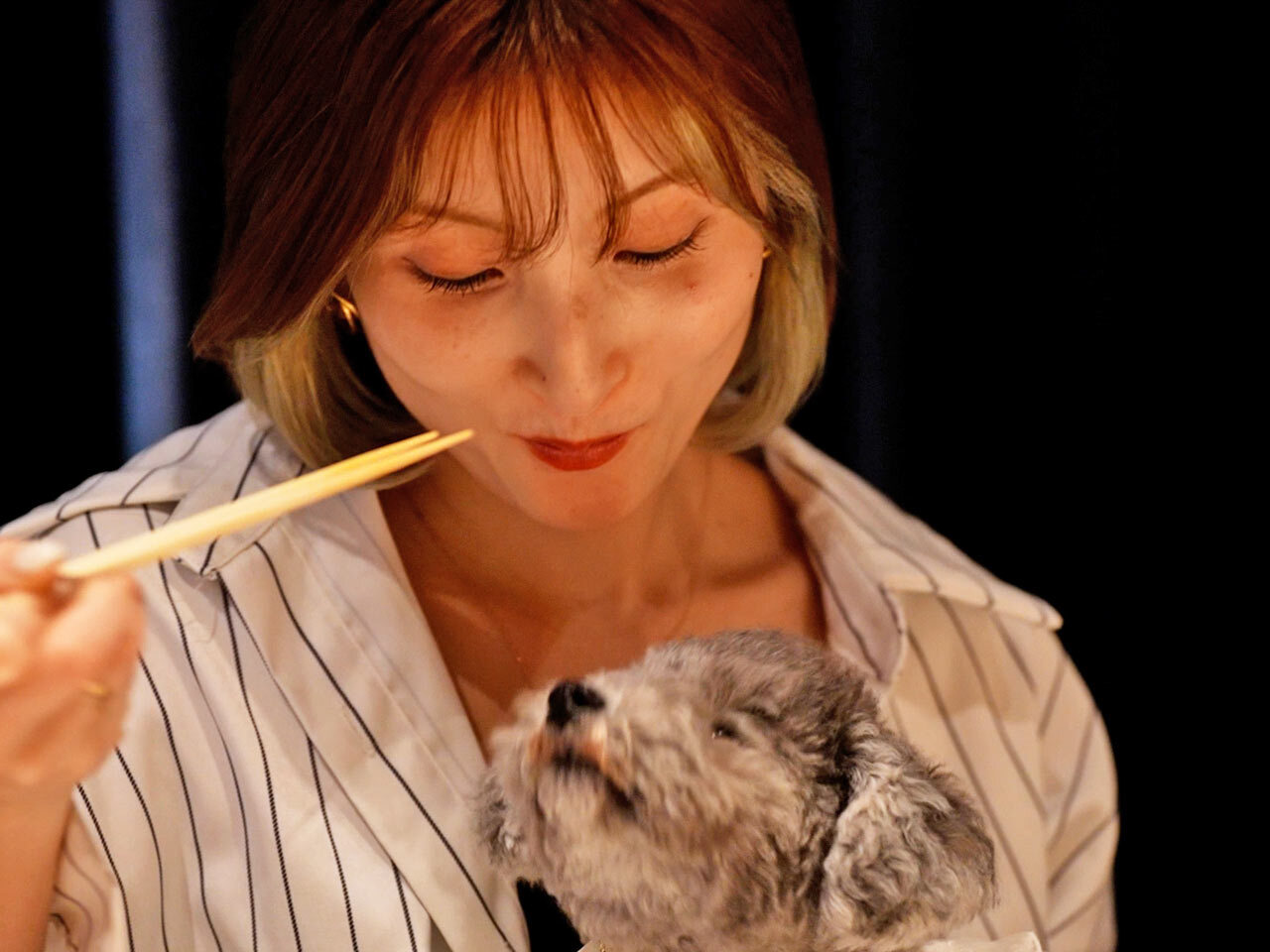 飼い主が鮨を味わっている間、愛犬たちもおとなしくその様子を見守る。