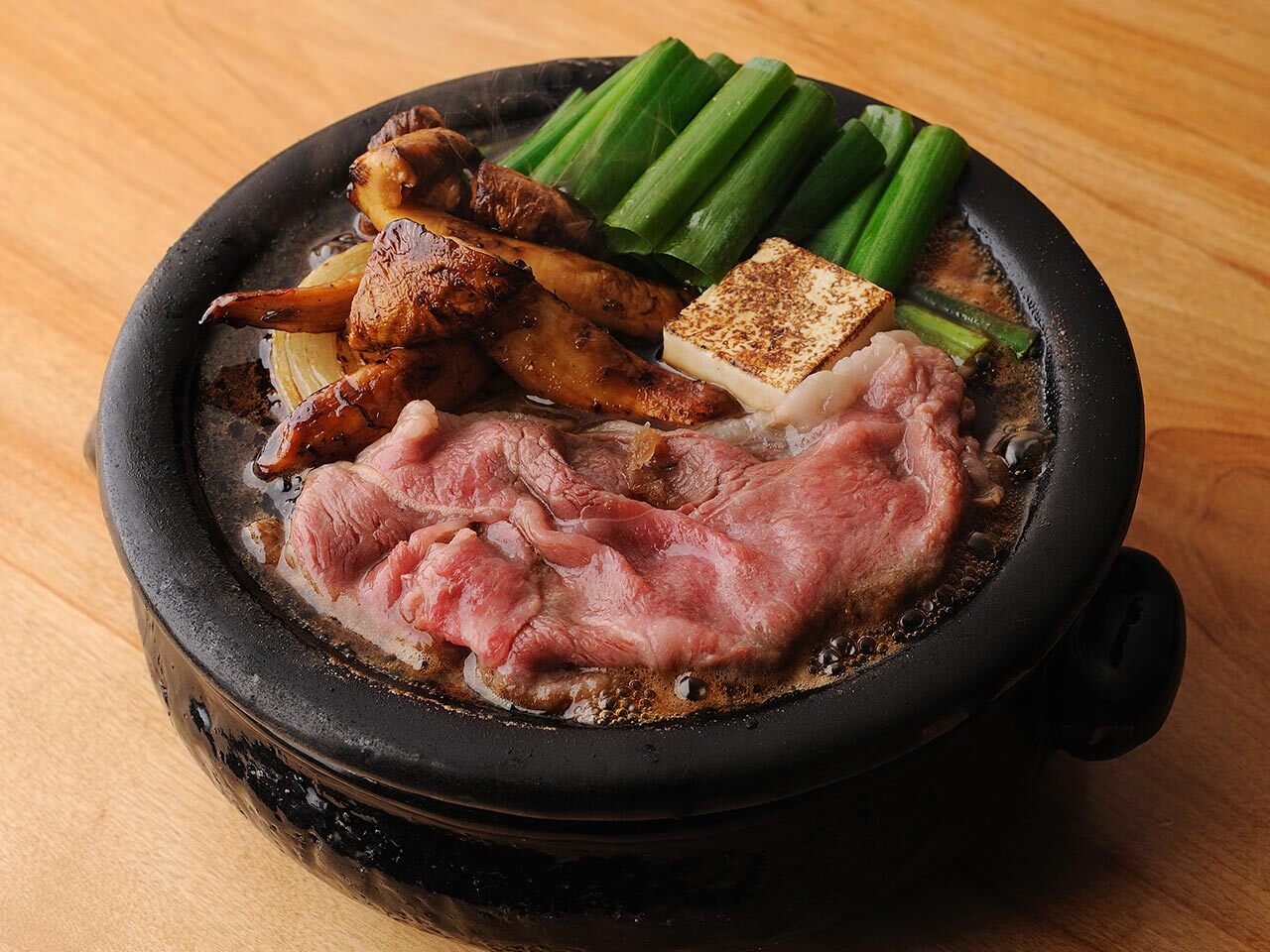 ベストセラーの「飛騨牛のすき煮」(¥15,400/サ別)は、“宝楽”という陶器で火入れし、肉の旨みを野菜に染み込ませて熱々の状態で提供される。