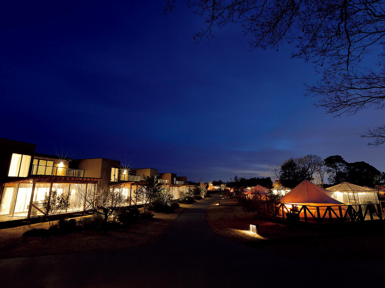 約5万㎡の広大な敷地は緑豊かで、広い空の下でゆったりと過ごすことができる。グランピングというと昼のイメージが強いかもしれないが、ここでは夜のひとときも心に残る。