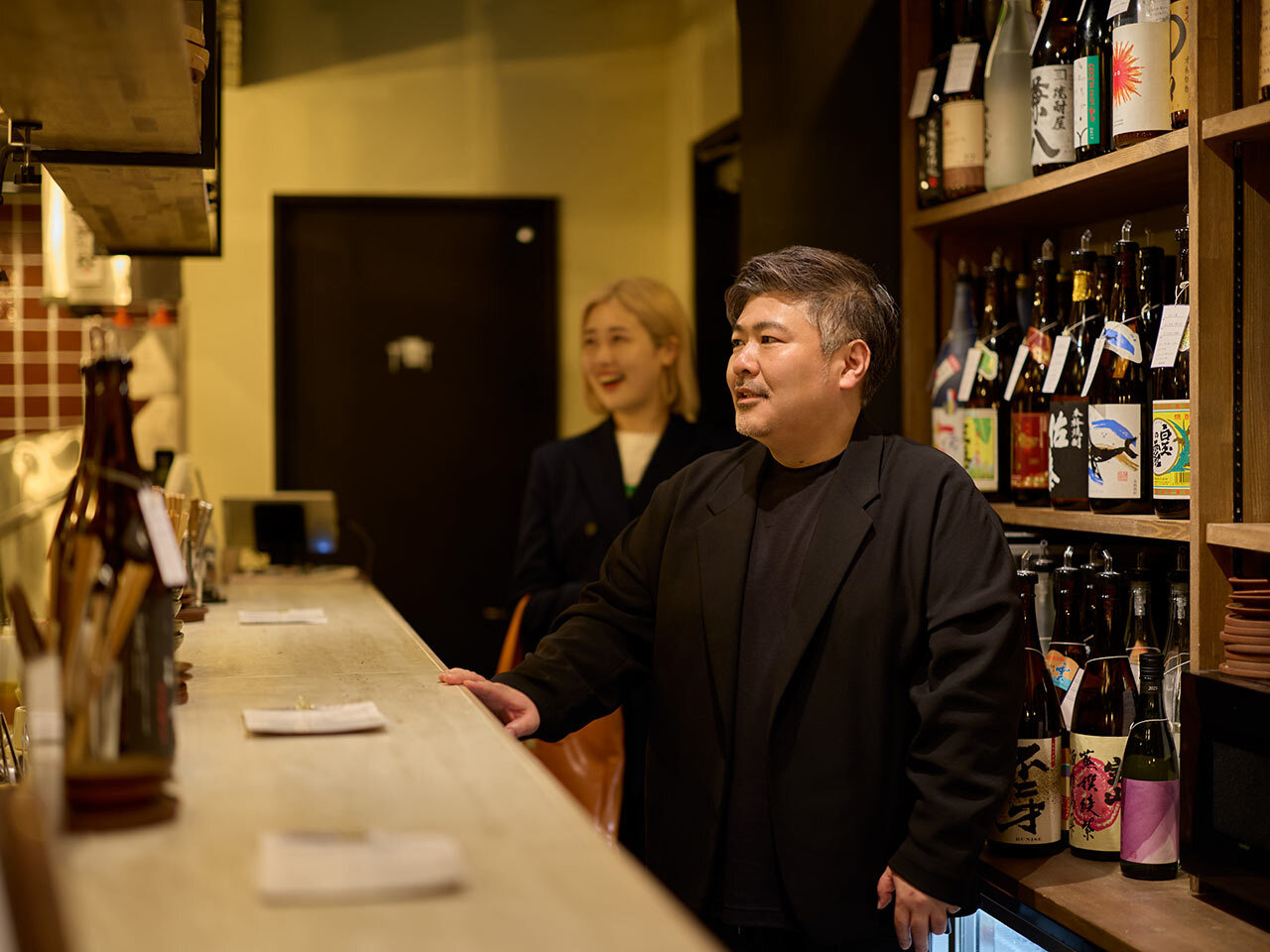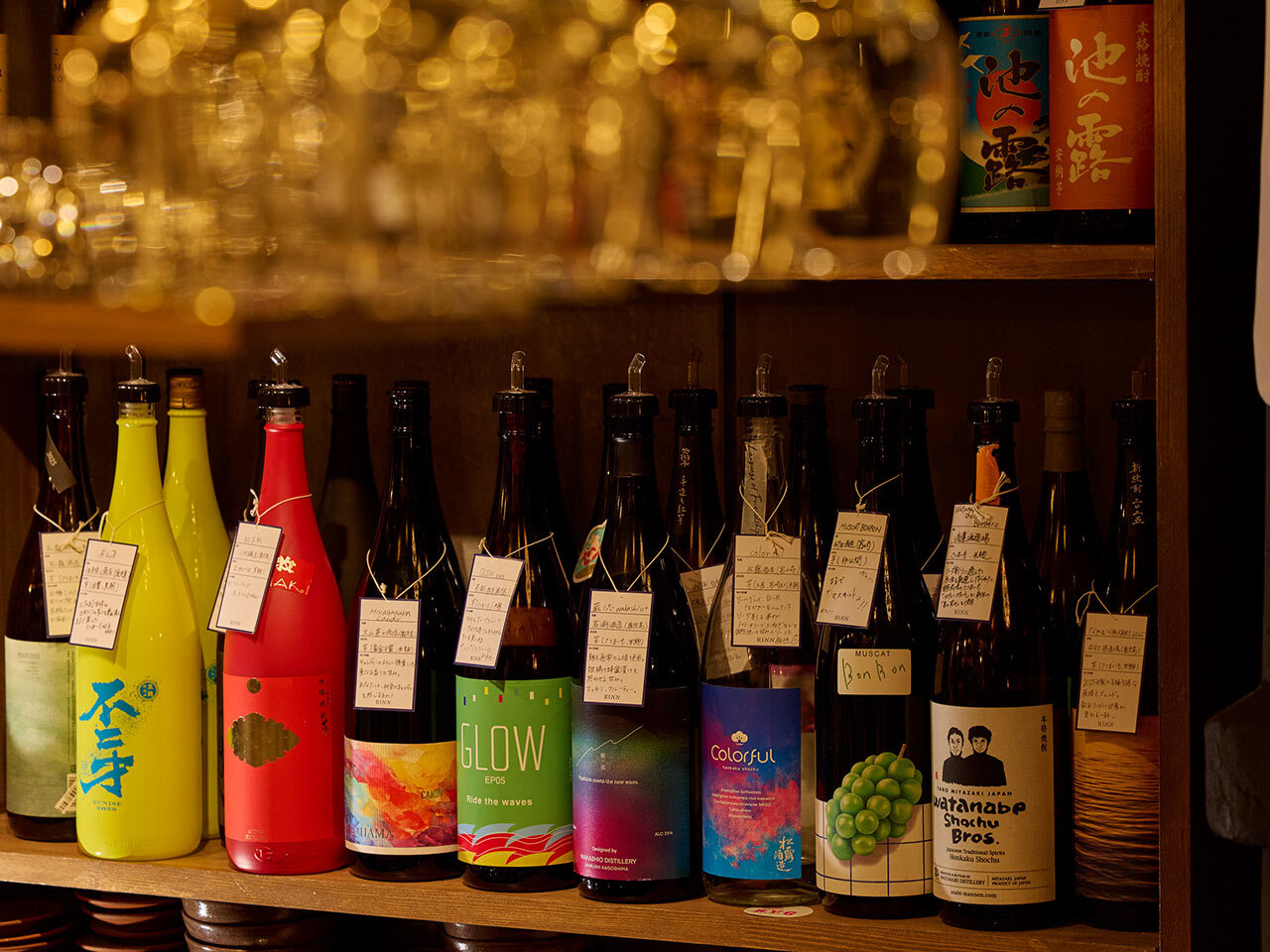 そう、ふたりが飲んでいるのは、同店の名物であるクラフト焼酎。いわゆる焼酎のイメージとは異なる多色使いのエチケットは良い意味で味の予想がつきづらく、選ぶ際にも一盛り上がり。