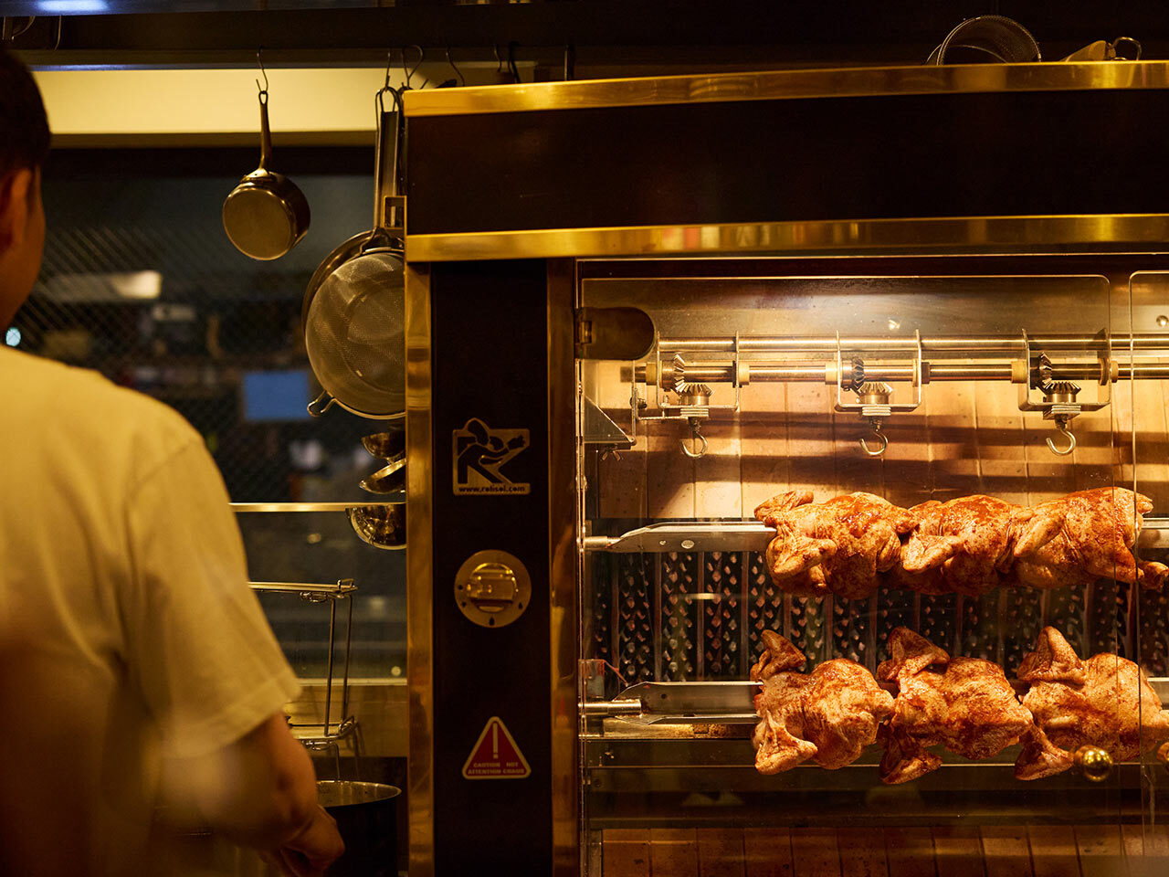 名物のロティサリーチキンはフランス製のロースターでゆっくり時間をかけて焼き上げられる。
