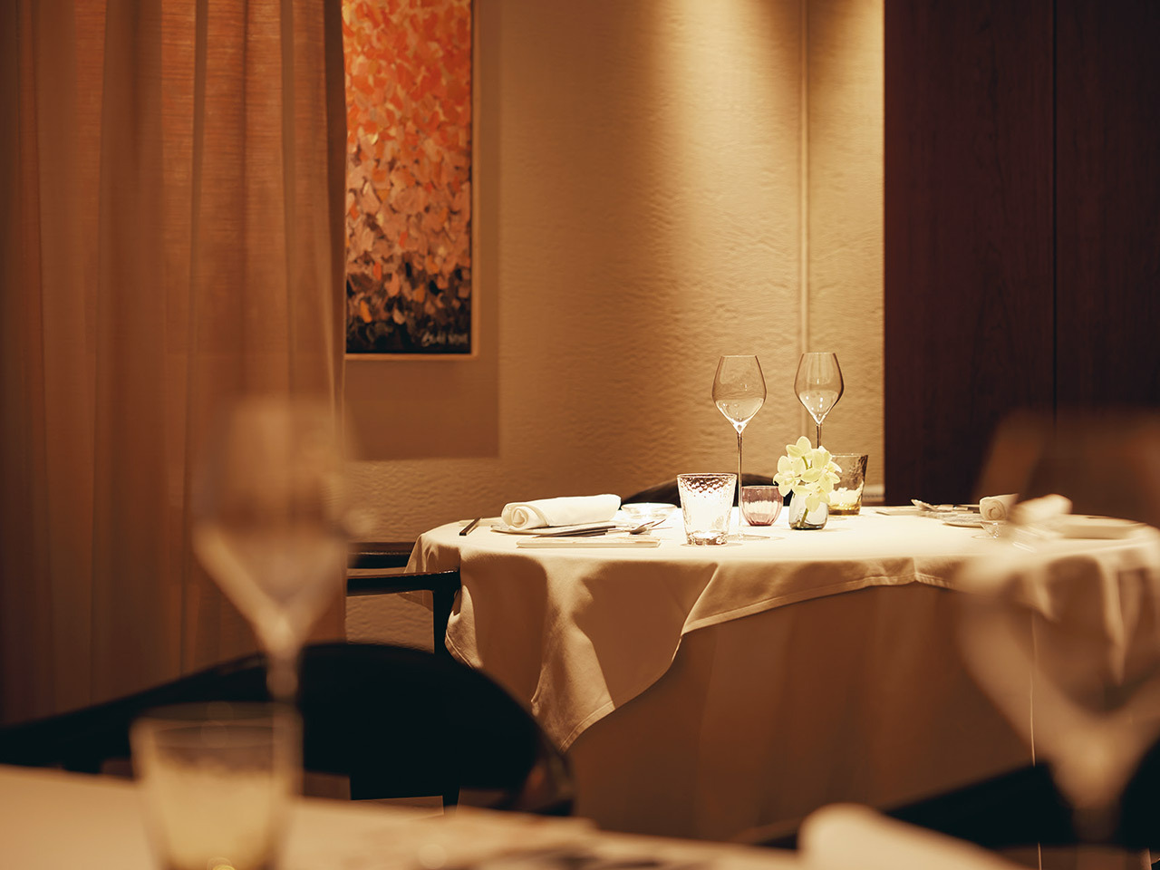 洗練された街に潜む隠れ家レストランの扉を開けると、エレガントな空間が広がる。